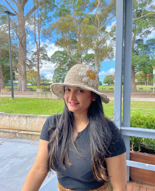 Handmade Hemp Cotton Crochet Sun Hat with Daisy – Organic Bucket Hat from Nepal